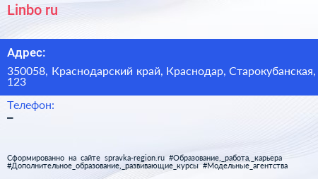 Linbo.ru по адресу 350058, Краснодарский край, Краснодар, Старокубанская, 123 в дальнейшем Организация, размещена в следующих категориях:
