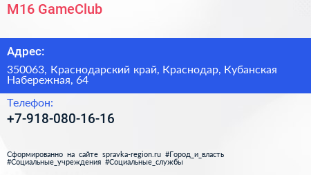 M16 GameClub по адресу 350063, Краснодарский край, Краснодар, Кубанская Набережная, 64 в дальнейшем Организация, размещена в следующих категориях: