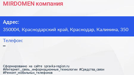 MIRDOMEN, компания по адресу 350004, Краснодарский край, Краснодар, Калинина, 350 в дальнейшем Организация, размещена в следующих категориях: