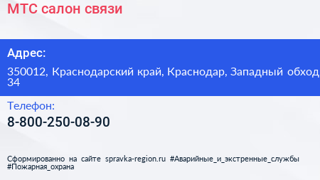 МТС, салон связи по адресу 350012, Краснодарский край, Краснодар, Западный обход, 34 в дальнейшем Организация, размещена в следующих категориях: