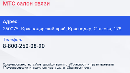 МТС, салон связи по адресу 350075, Краснодарский край, Краснодар, Стасова, 178 в дальнейшем Организация, размещена в следующих категориях: