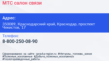 МТС, салон связи по адресу 350089, Краснодарский край, Краснодар, проспект Чекистов, 17 в дальнейшем Организация, размещена в следующих категориях: