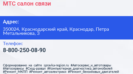 МТС, салон связи по адресу 350024, Краснодарский край, Краснодар, Петра Метальникова, 3 в дальнейшем Организация, размещена в следующих категориях: