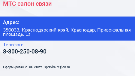 МТС, салон связи по адресу 350033, Краснодарский край, Краснодар, Привокзальная площадь, 1а в дальнейшем Организация, размещена в следующих категориях: