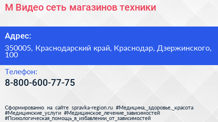 М.Видео, сеть магазинов техники по адресу 350005, Краснодарский край, Краснодар, Дзержинского, 100 в дальнейшем Организация, размещена в следующих категориях: