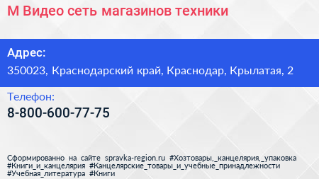 М.Видео, сеть магазинов техники по адресу 350023, Краснодарский край, Краснодар, Крылатая, 2 в дальнейшем Организация, размещена в следующих категориях: