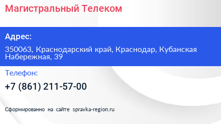 Магистральный Телеком по адресу 350063, Краснодарский край, Краснодар, Кубанская Набережная, 39 в дальнейшем Организация, размещена в следующих категориях: