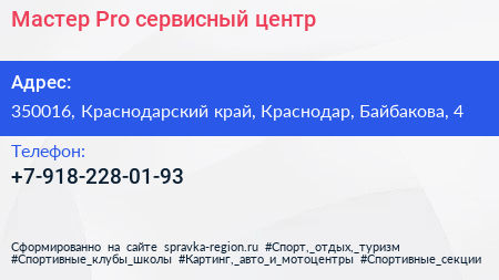 Мастер-Pro, сервисный центр по адресу 350016, Краснодарский край, Краснодар, Байбакова, 4 в дальнейшем Организация, размещена в следующих категориях: