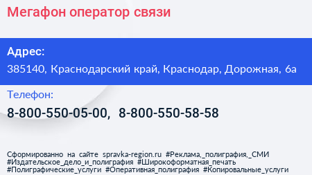 Мегафон, оператор связи по адресу 385140, Краснодарский край, Краснодар, Дорожная, 6а в дальнейшем Организация, размещена в следующих категориях: