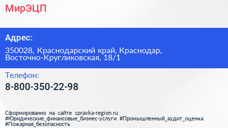 МирЭЦП по адресу 350028, Краснодарский край, Краснодар, Восточно-Кругликовская, 18/1 в дальнейшем Организация, размещена в следующих категориях: