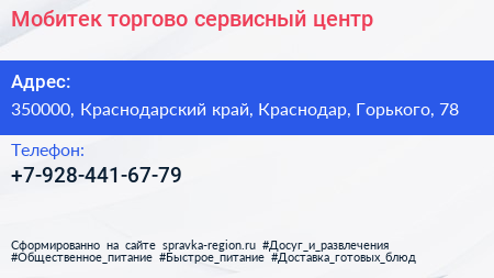 Мобитек, торгово-сервисный центр по адресу 350000, Краснодарский край, Краснодар, Горького, 78 в дальнейшем Организация, размещена в следующих категориях: