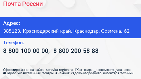 Почта России по адресу 385123, Краснодарский край, Краснодар, Совмена, 62 в дальнейшем Организация, размещена в следующих категориях: