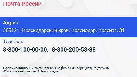Почта России по адресу 385121, Краснодарский край, Краснодар, Красная, 31 в дальнейшем Организация, размещена в следующих категориях: