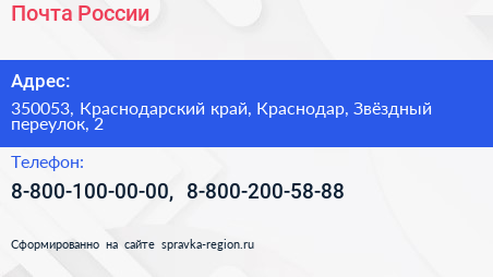 Почта России по адресу 350053, Краснодарский край, Краснодар, Звёздный переулок, 2 в дальнейшем Организация, размещена в следующих категориях: