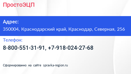 ПростоЭЦП по адресу 350004, Краснодарский край, Краснодар, Северная, 256 в дальнейшем Организация, размещена в следующих категориях: