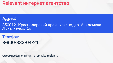 Relevant, интернет-агентство по адресу 350012, Краснодарский край, Краснодар, Академика Лукьяненко, 16 в дальнейшем Организация, размещена в следующих категориях: