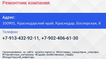Ремонтник, компания по адресу 350901, Краснодарский край, Краснодар, Боспорская, 8 в дальнейшем Организация, размещена в следующих категориях: