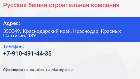 Русские башни, строительная компания по адресу 350049, Краснодарский край, Краснодар, Красных Партизан, 489 в дальнейшем Организация, размещена в следующих категориях: