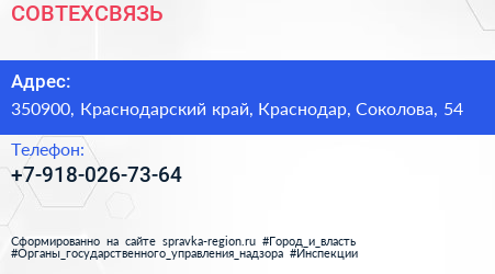 СОВТЕХСВЯЗЬ по адресу 350900, Краснодарский край, Краснодар, Соколова, 54 в дальнейшем Организация, размещена в следующих категориях: