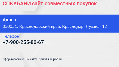 СПКУБАНИ, сайт совместных покупок по адресу 350051, Краснодарский край, Краснодар, Лузана, 12 в дальнейшем Организация, размещена в следующих категориях: