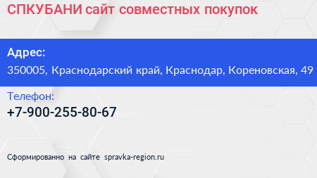 СПКУБАНИ, сайт совместных покупок по адресу 350005, Краснодарский край, Краснодар, Кореновская, 49 в дальнейшем Организация, размещена в следующих категориях: