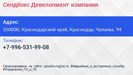 Сендбокс Девелопмент, компания по адресу 350000, Краснодарский край, Краснодар, Чапаева, 94 в дальнейшем Организация, размещена в следующих категориях: