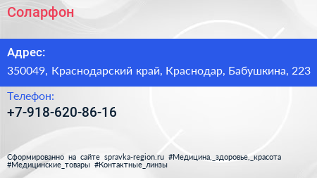 Соларфон по адресу 350049, Краснодарский край, Краснодар, Бабушкина, 223 в дальнейшем Организация, размещена в следующих категориях: