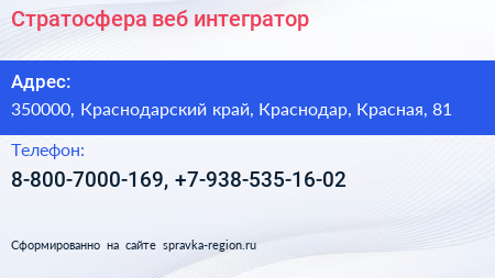 Стратосфера, веб-интегратор по адресу 350000, Краснодарский край, Краснодар, Красная, 81 в дальнейшем Организация, размещена в следующих категориях: