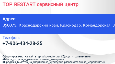 TOP RESTART, сервисный центр по адресу 350073, Краснодарский край, Краснодар, Командорская, 3 к1 в дальнейшем Организация, размещена в следующих категориях: