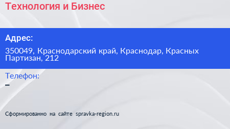Технология и Бизнес по адресу 350049, Краснодарский край, Краснодар, Красных Партизан, 212 в дальнейшем Организация, размещена в следующих категориях: