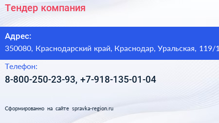 Тендер, компания по адресу 350080, Краснодарский край, Краснодар, Уральская, 119/1 в дальнейшем Организация, размещена в следующих категориях: