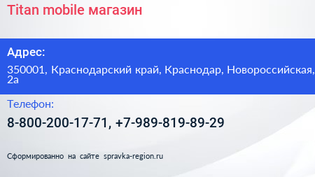 Titan-mobile, магазин по адресу 350001, Краснодарский край, Краснодар, Новороссийская, 2а в дальнейшем Организация, размещена в следующих категориях: