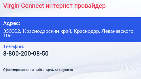 Virgin Connect, интернет-провайдер по адресу 350002, Краснодарский край, Краснодар, Леваневского, 106 в дальнейшем Организация, размещена в следующих категориях:
