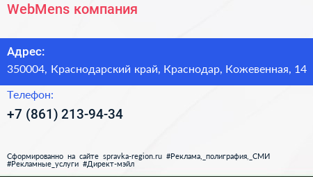 WebMens, компания по адресу 350004, Краснодарский край, Краснодар, Кожевенная, 14 в дальнейшем Организация, размещена в следующих категориях:
