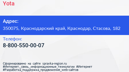 Yota по адресу 350075, Краснодарский край, Краснодар, Стасова, 182 в дальнейшем Организация, размещена в следующих категориях: