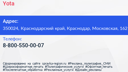Yota по адресу 350024, Краснодарский край, Краснодар, Московская, 162 в дальнейшем Организация, размещена в следующих категориях: