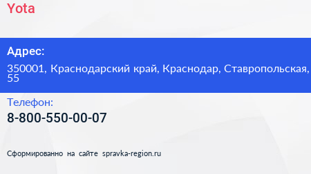 Yota по адресу 350001, Краснодарский край, Краснодар, Ставропольская, 55 в дальнейшем Организация, размещена в следующих категориях: