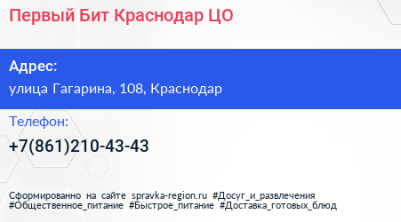 Первый Бит Краснодар ЦО по адресу улица Гагарина, 108, Краснодар в дальнейшем Организация, размещена в следующих категориях: