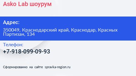 Asko Lab, шоурум по адресу 350049, Краснодарский край, Краснодар, Красных Партизан, 134 в дальнейшем Организация, размещена в следующих категориях: