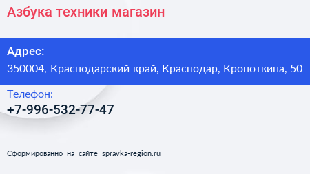 Азбука техники, магазин по адресу 350004, Краснодарский край, Краснодар, Кропоткина, 50 в дальнейшем Организация, размещена в следующих категориях:
