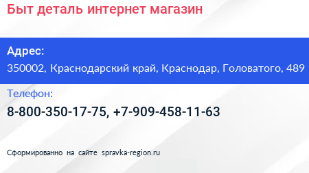 Быт деталь, интернет-магазин по адресу 350002, Краснодарский край, Краснодар, Головатого, 489 в дальнейшем Организация, размещена в следующих категориях:
