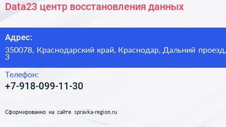 Data23, центр восстановления данных по адресу 350078, Краснодарский край, Краснодар, Дальний проезд, 3 в дальнейшем Организация, размещена в следующих категориях: