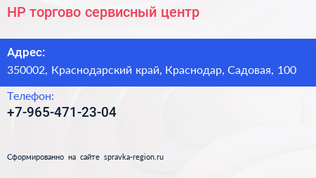 HP, торгово-сервисный центр по адресу 350002, Краснодарский край, Краснодар, Садовая, 100 в дальнейшем Организация, размещена в следующих категориях: