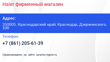 Haier, фирменный магазин по адресу 350005, Краснодарский край, Краснодар, Дзержинского, 100 в дальнейшем Организация, размещена в следующих категориях: