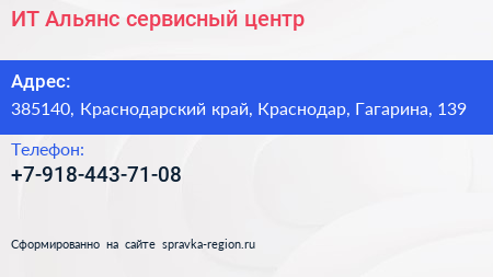 ИТ Альянс, сервисный центр по адресу 385140, Краснодарский край, Краснодар, Гагарина, 139 в дальнейшем Организация, размещена в следующих категориях: