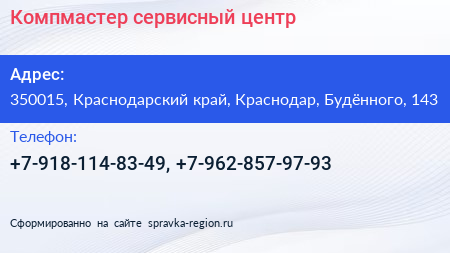 Компмастер, сервисный центр по адресу 350015, Краснодарский край, Краснодар, Будённого, 143 в дальнейшем Организация, размещена в следующих категориях: