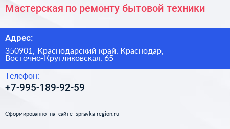 Мастерская по ремонту бытовой техники по адресу 350901, Краснодарский край, Краснодар, Восточно-Кругликовская, 65 в дальнейшем Организация, размещена в следующих категориях: