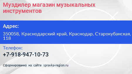 Муздилер, магазин музыкальных инструментов по адресу 350058, Краснодарский край, Краснодар, Старокубанская, 118 в дальнейшем Организация, размещена в следующих категориях: