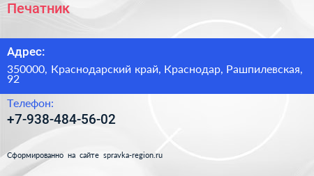 Печатник по адресу 350000, Краснодарский край, Краснодар, Рашпилевская, 92 в дальнейшем Организация, размещена в следующих категориях: