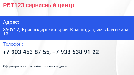 РБТ123, сервисный центр по адресу 350912, Краснодарский край, Краснодар, им. Лавочкина, 13 в дальнейшем Организация, размещена в следующих категориях: